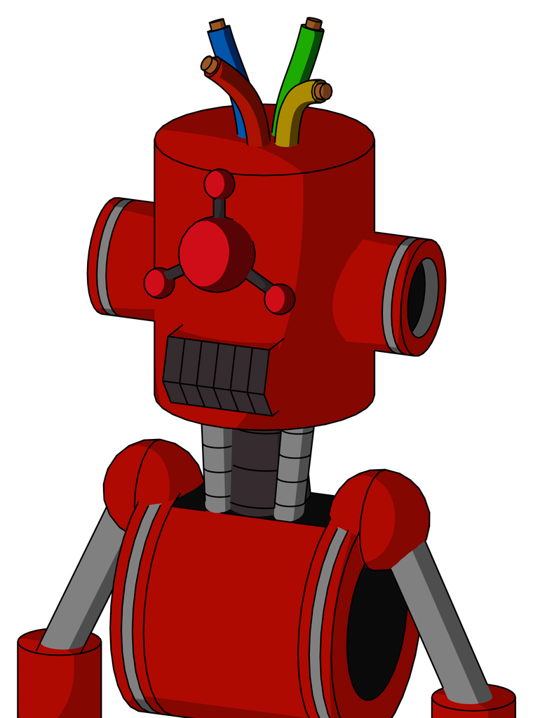 Red Mech With Cylinder Head And Dark Tooth Mouth And Cyclops Compound Eyes And Wire Hair