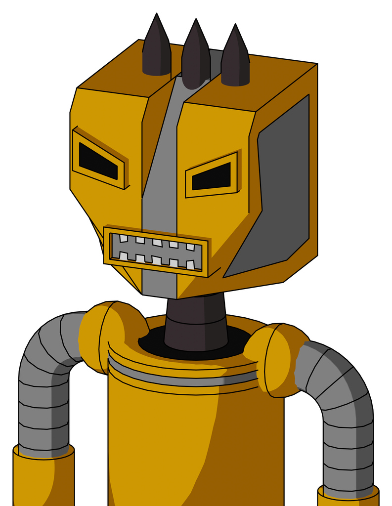 Yellow Robot With Mechanical Head And Square Mouth And Angry Eyes And Three Dark Spikes