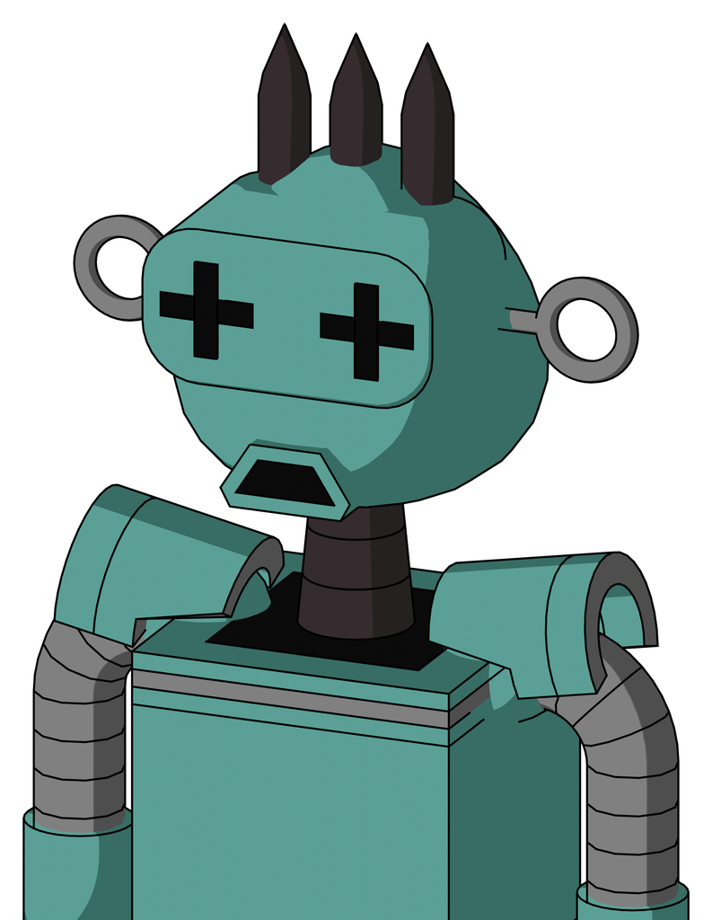 Greenish Mech With Rounded Head And Sad Mouth And Plus Sign Eyes And Three Dark Spikes