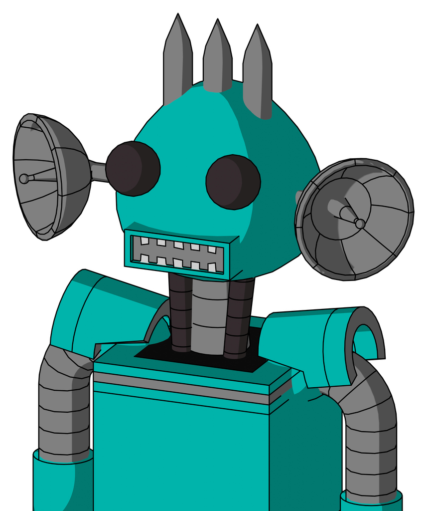 Greenish Robot With Rounded Head And Square Mouth And Two Eyes And Three Spiked